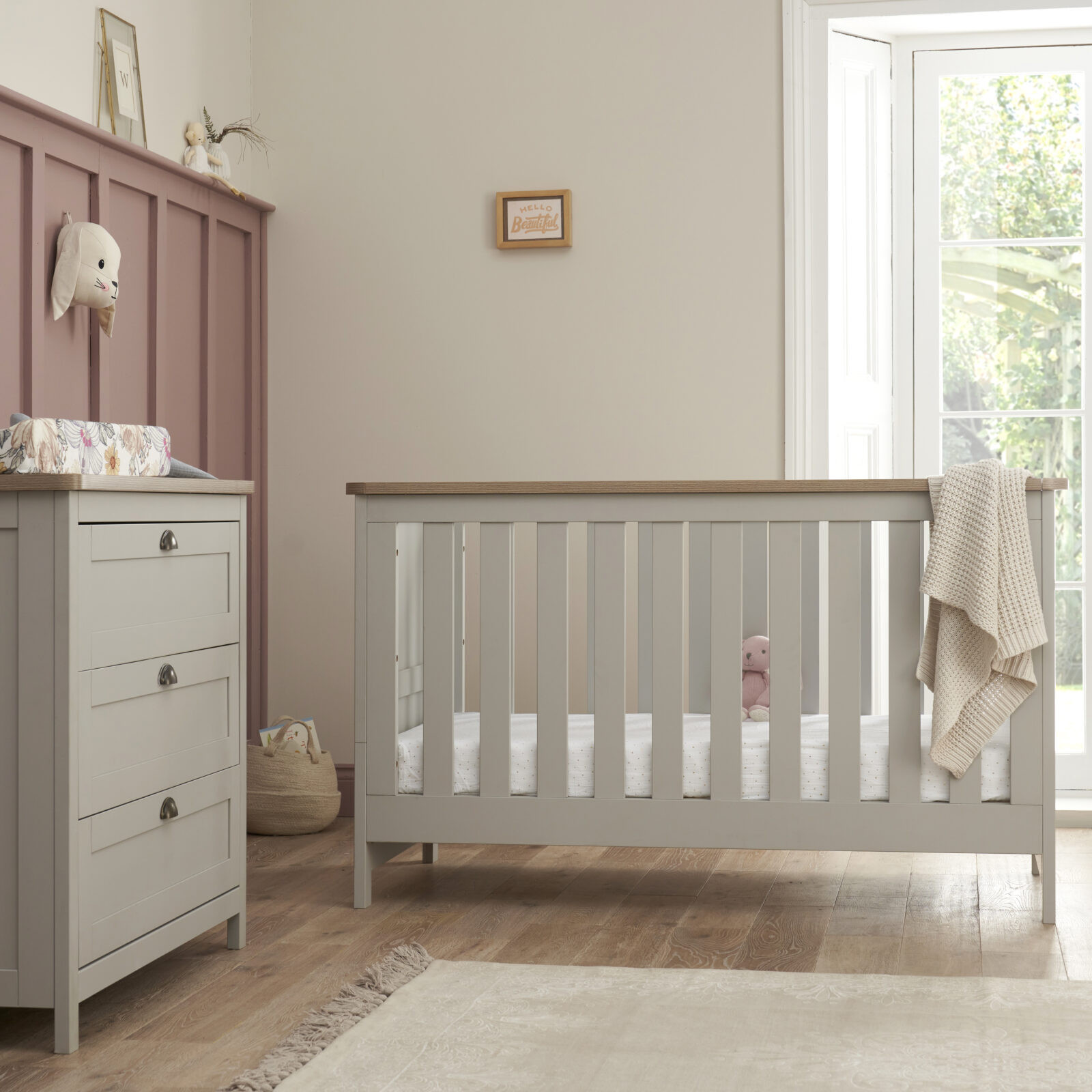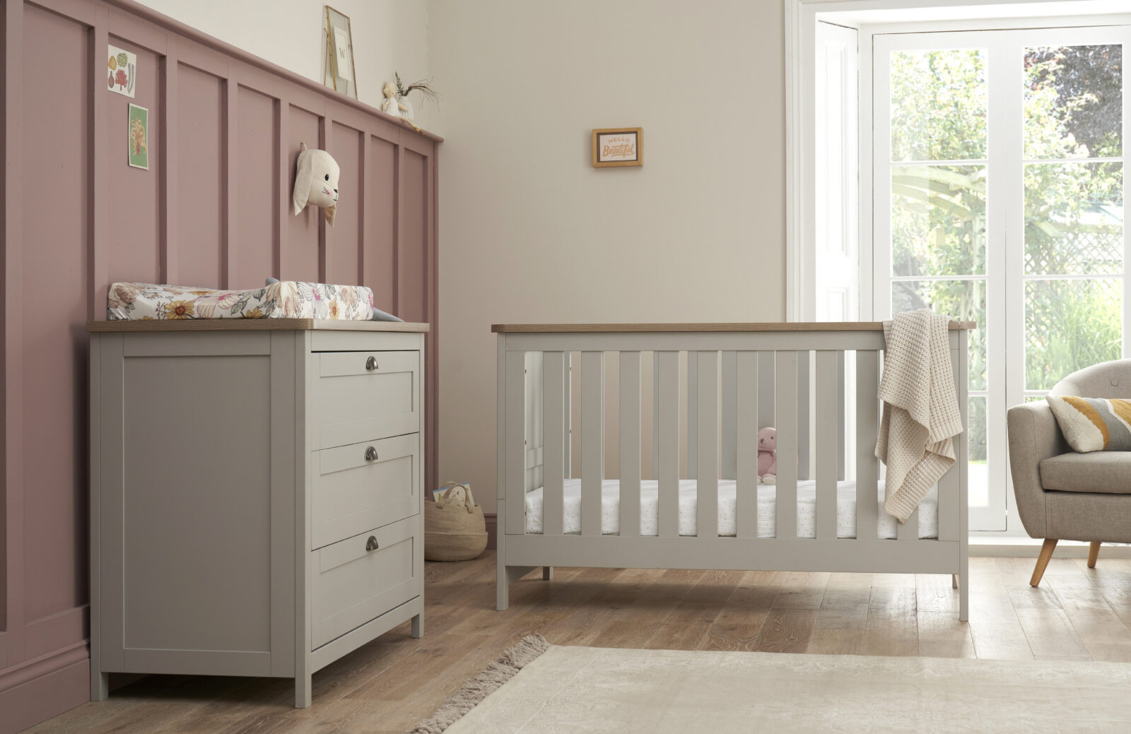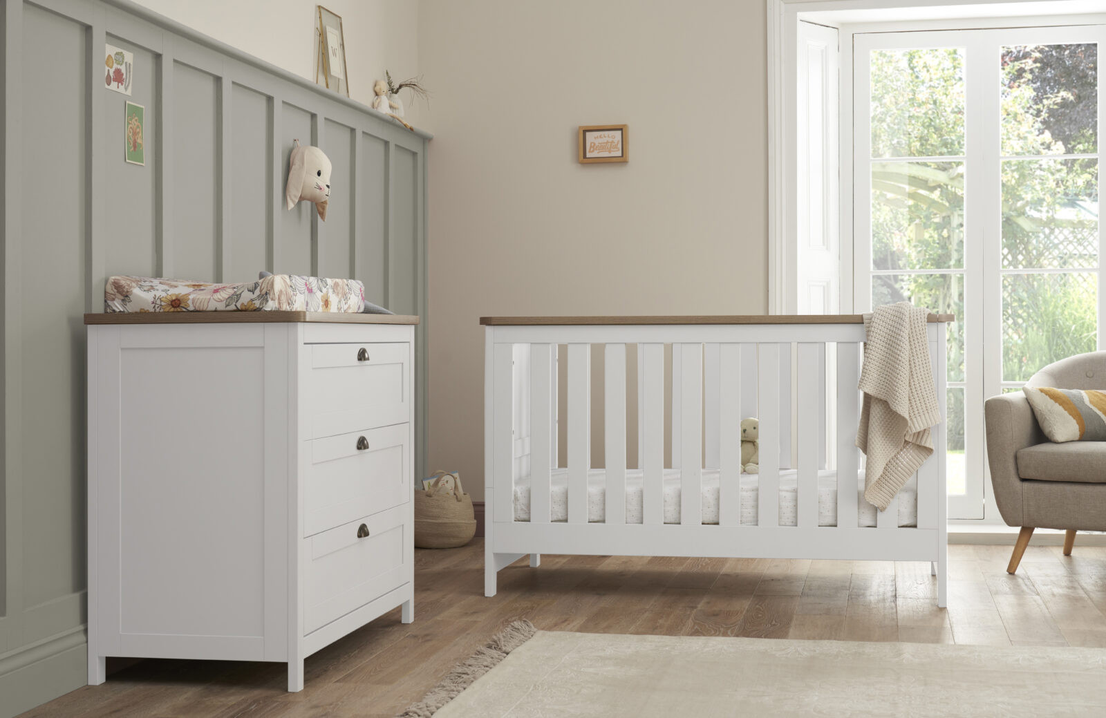 The shaker style chest changer features a fully removable changing top and the matching cot bed converts to junior bed and day bed, making this nursery set suitable for years to come.